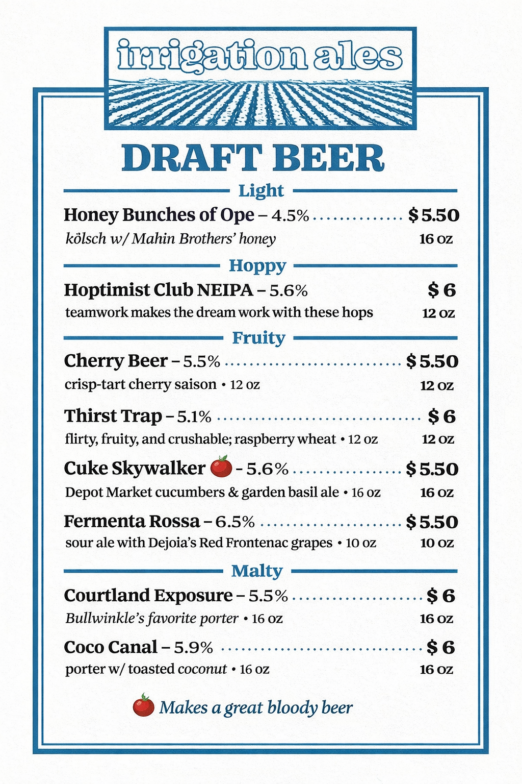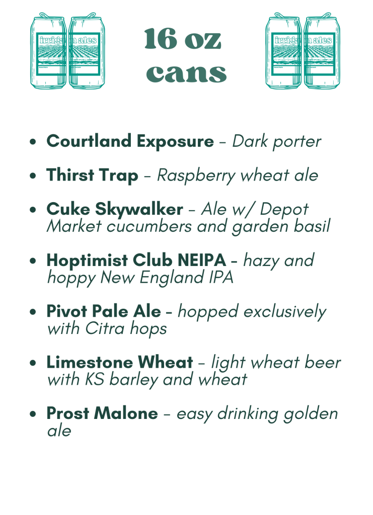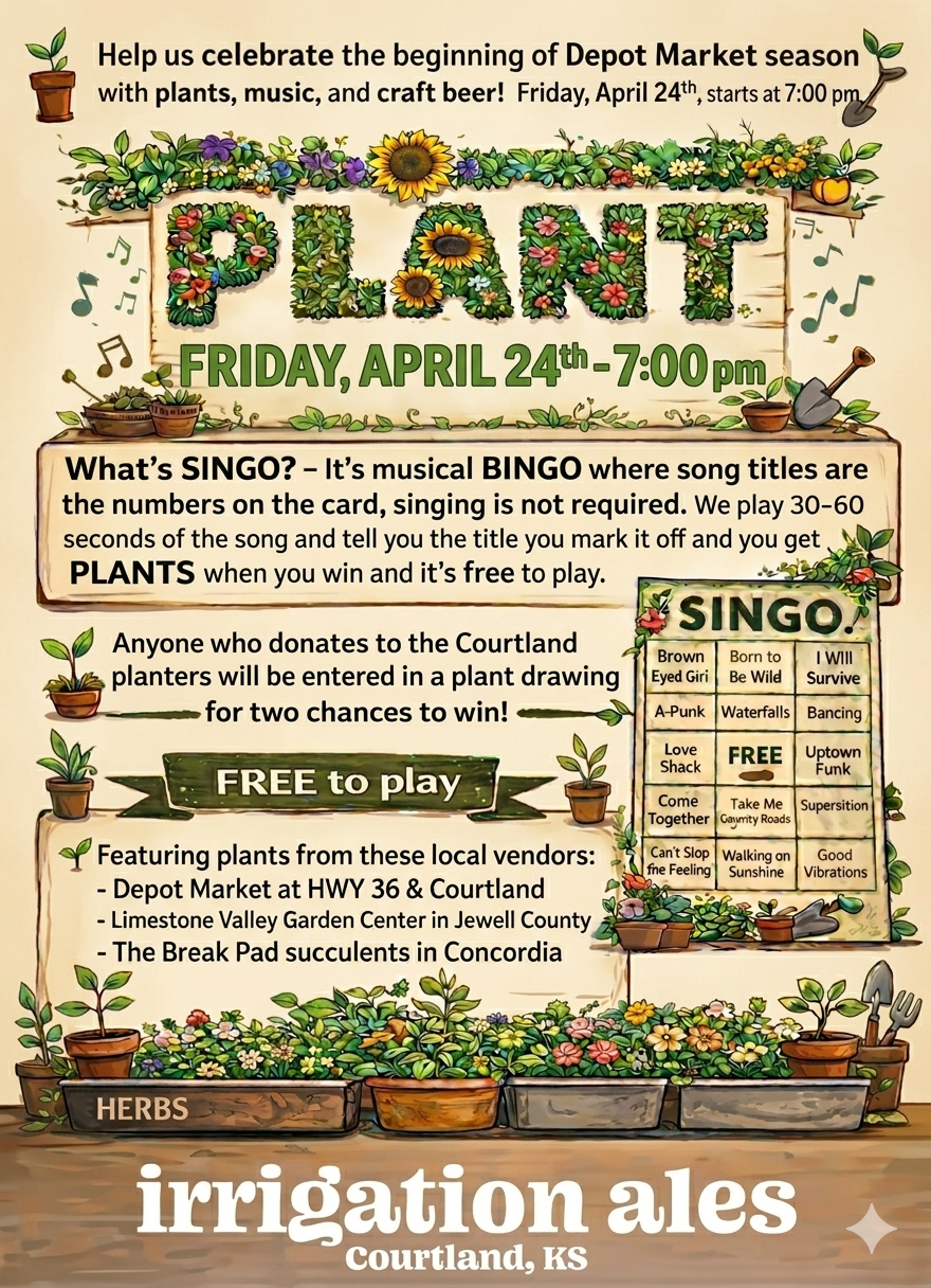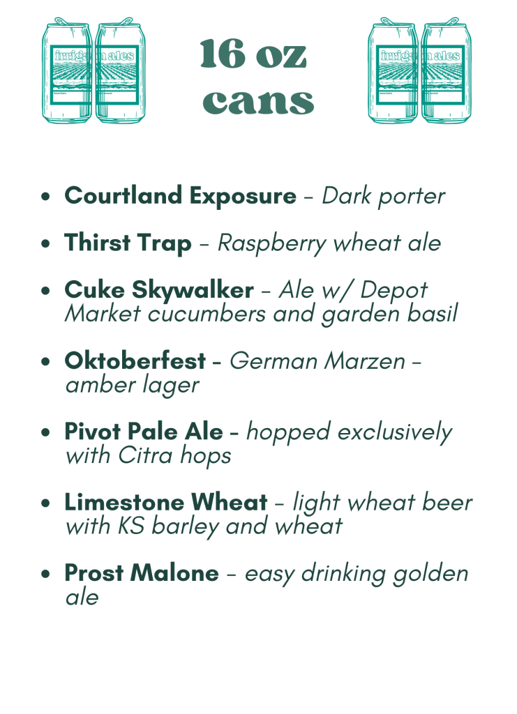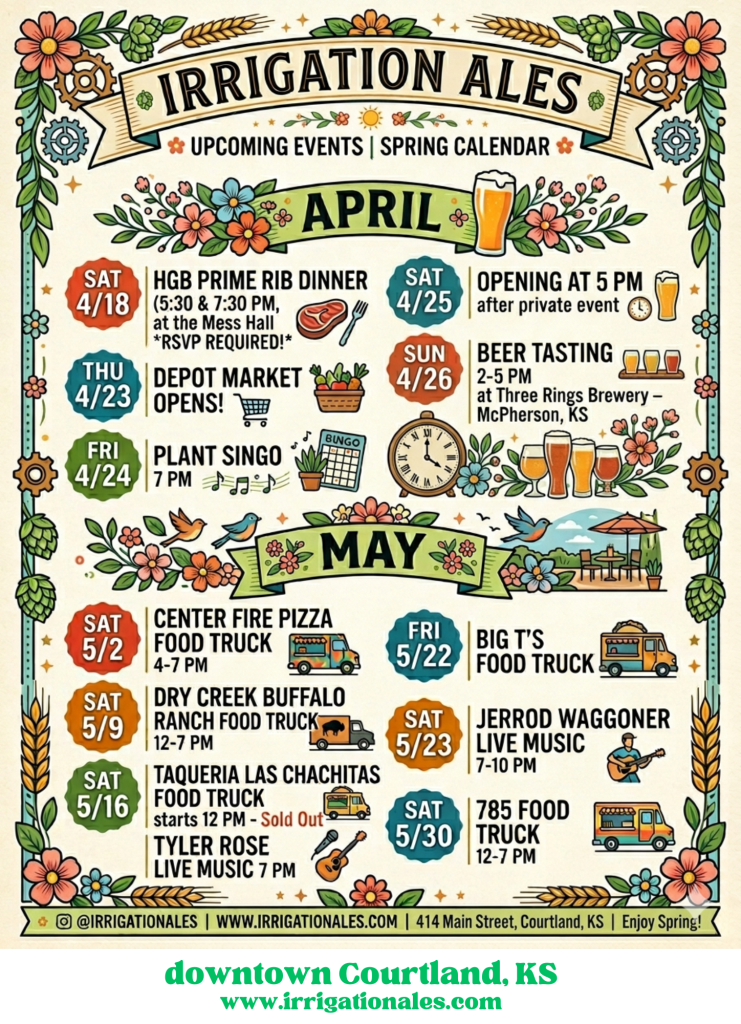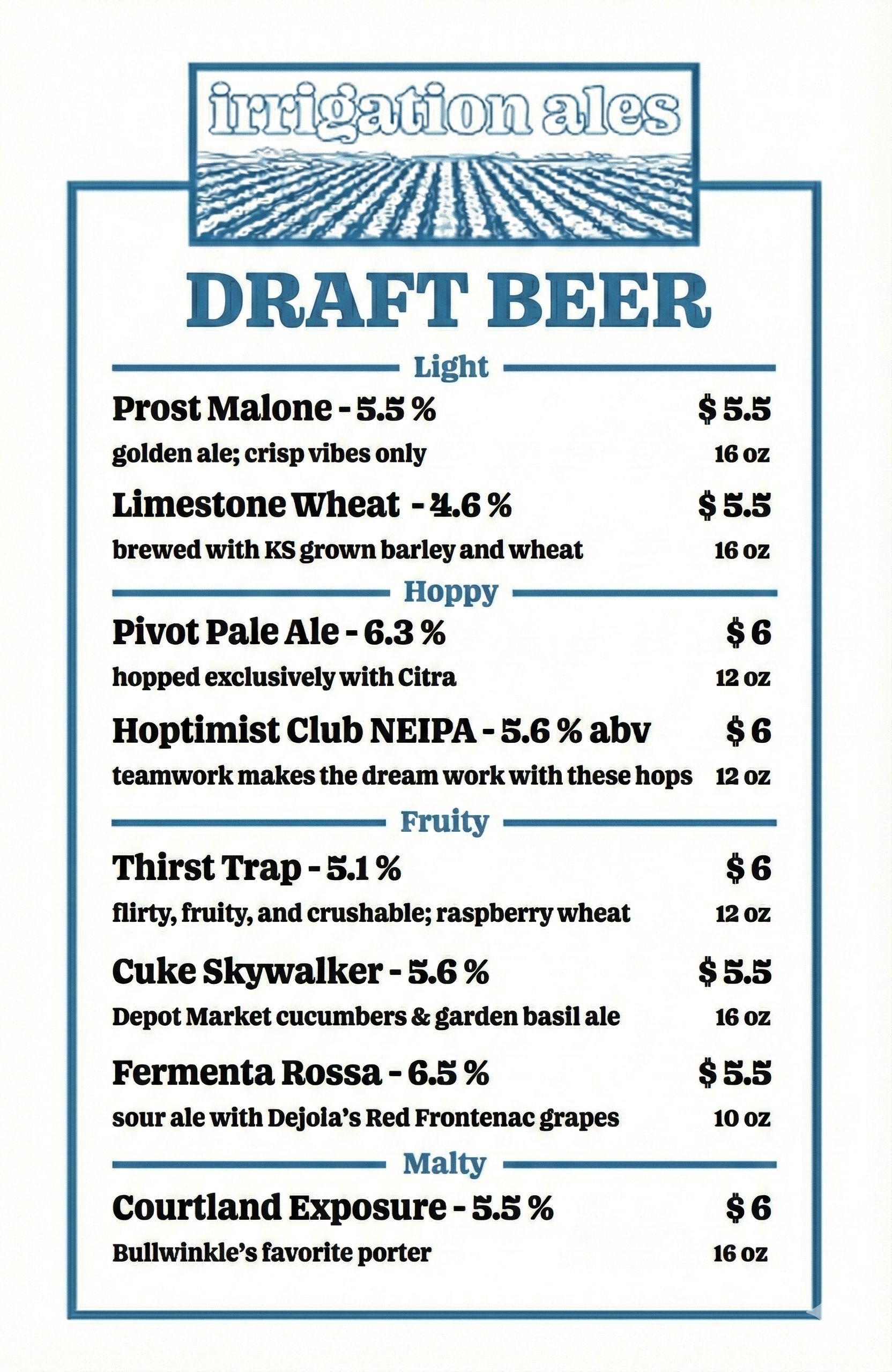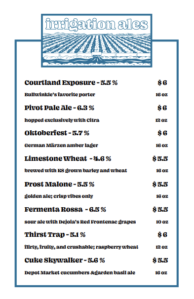 Irrigation Ales, a rural brewery in Courtland, KS (population: 294), offers eight handcrafted beers made with locally sourced ingredients like Kansas-grown malt, hops, fruits, veggies, and herbs. Our taproom is a space for people to connect through craft beer to our rural culture.