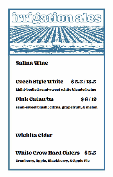We also feature handmade cocktails on draft alongside Kansas wines, White Crow Cider, and non-alcoholic kombucha from Apollo Fermentations.