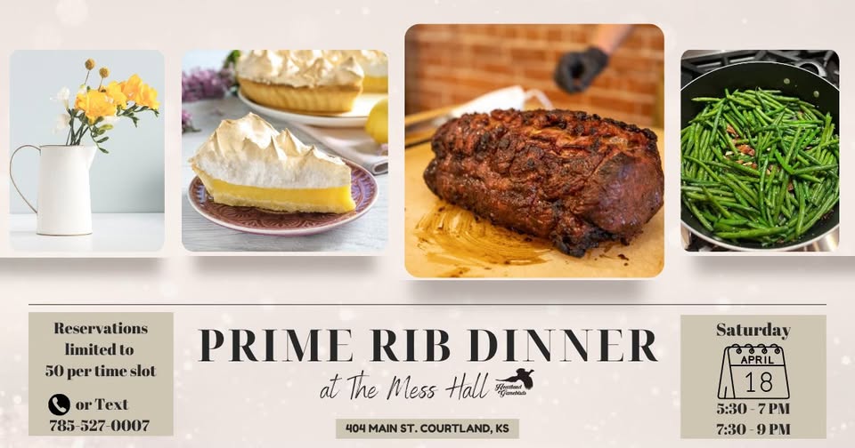 - 4/18 Saturday – Heartland Gamebirds is hosting two sessions of prime rib dinner at the Mess Hall at 5:30 pm or 7:30 pm.